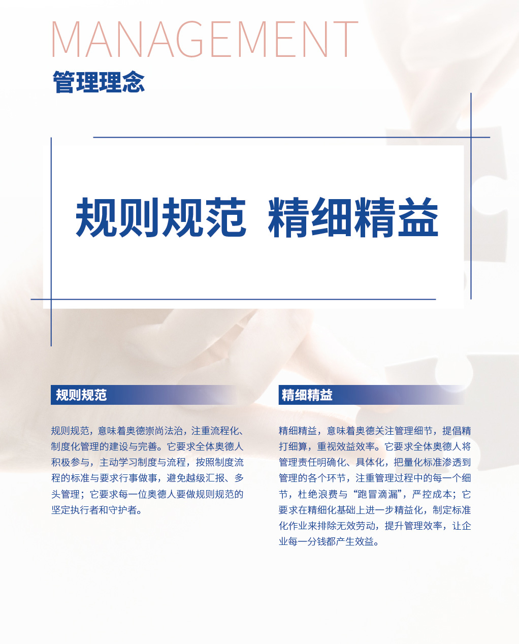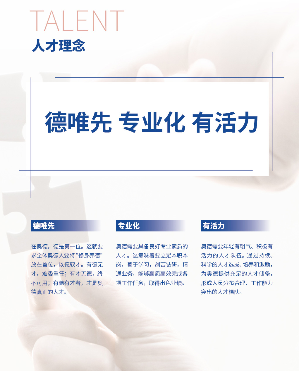 员工生活 企业标识 使命 愿景 核心价值观 奥德精神 基本理念 行为准则 禁忌行为 礼仪行为
